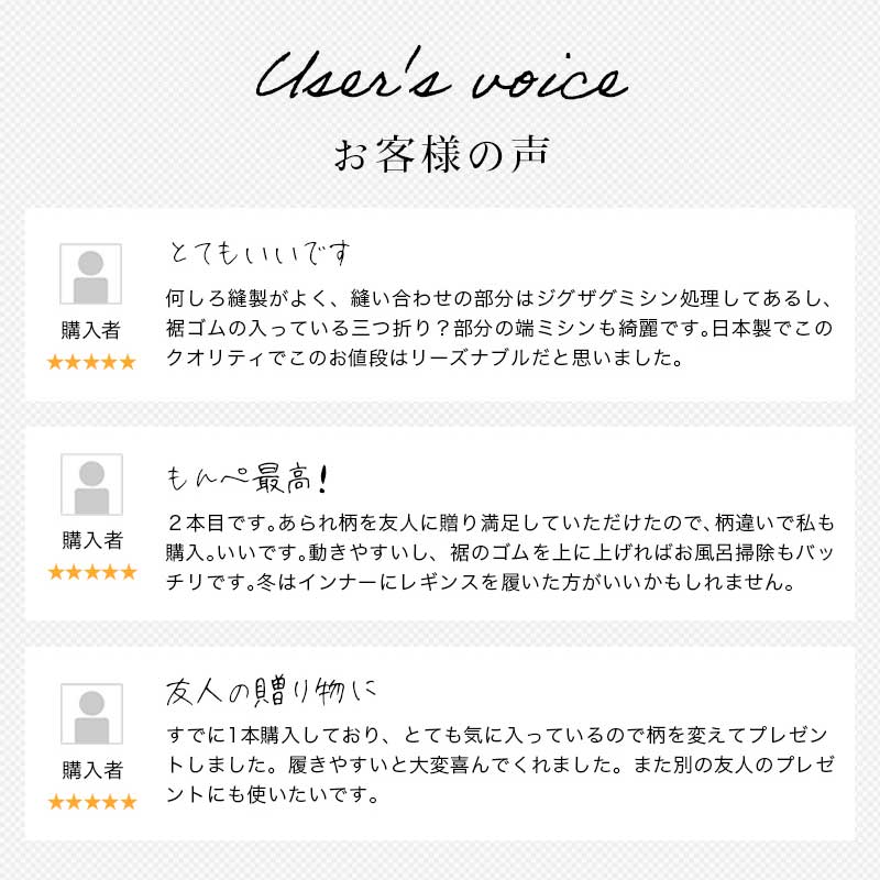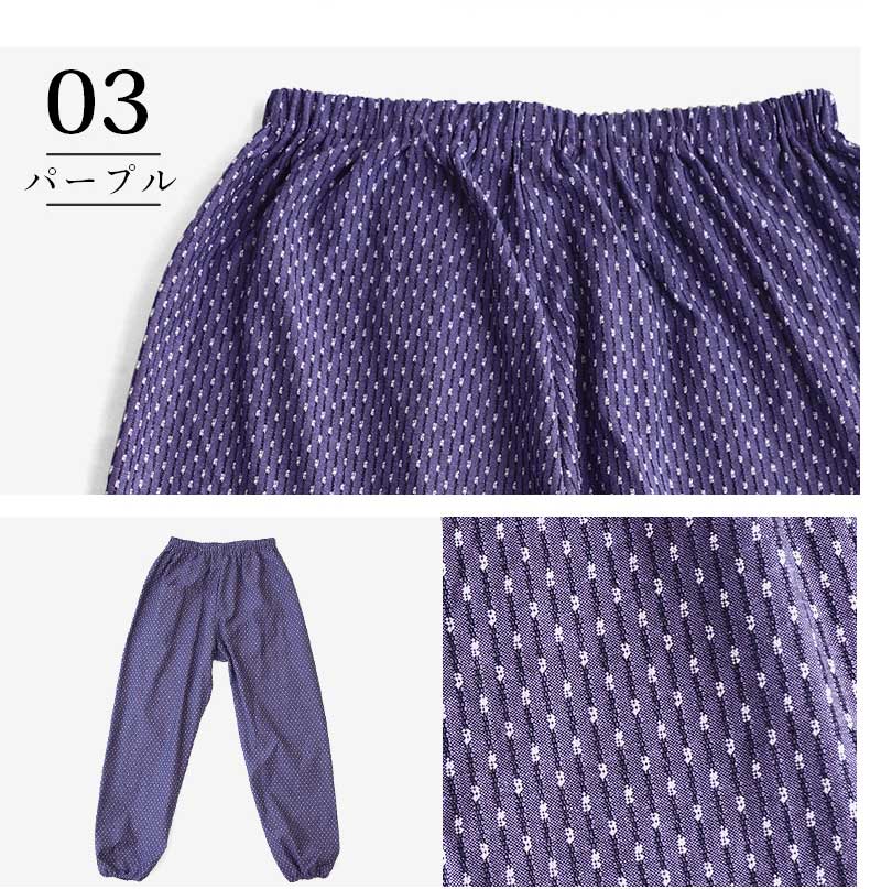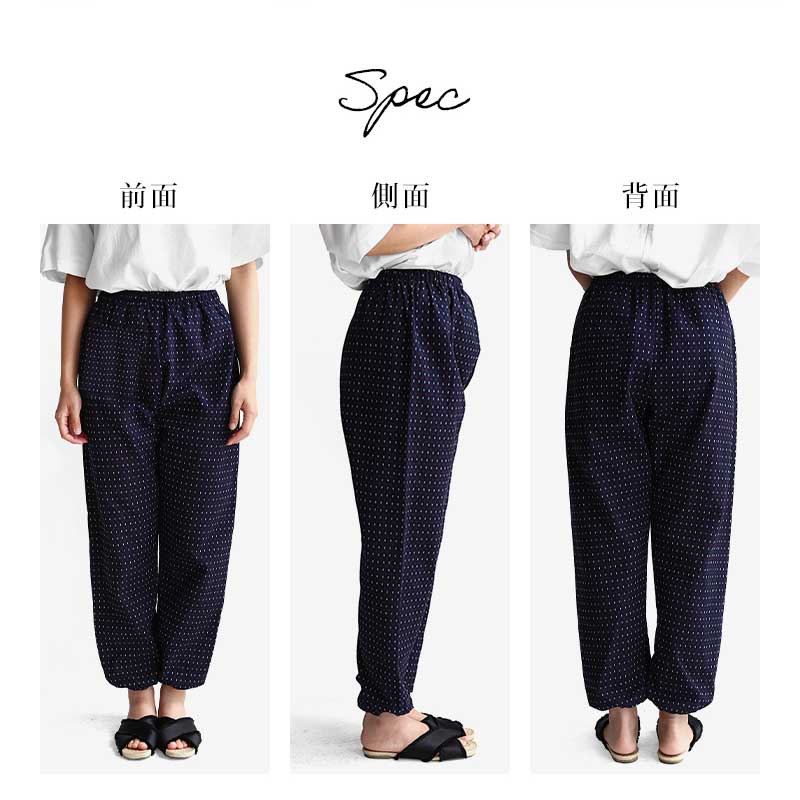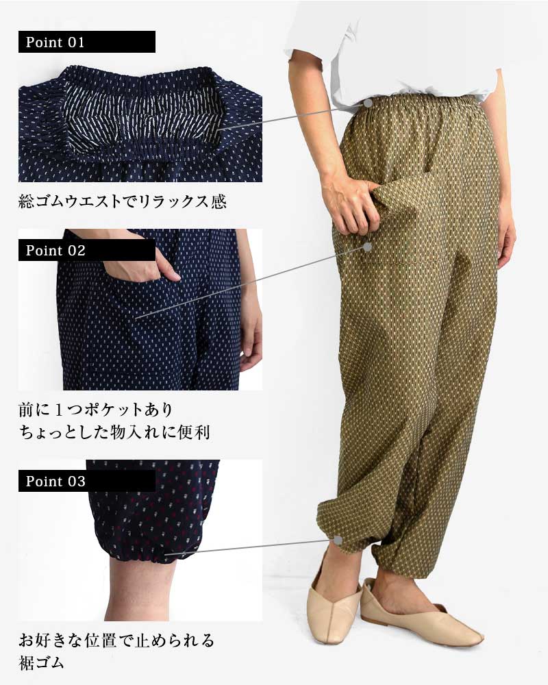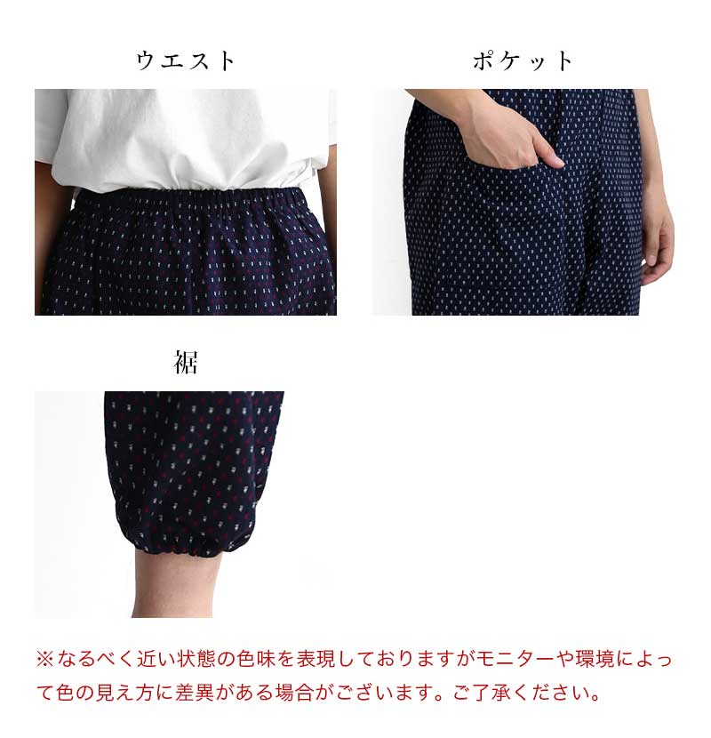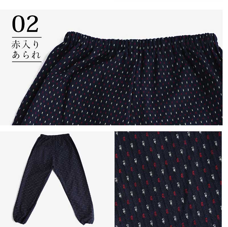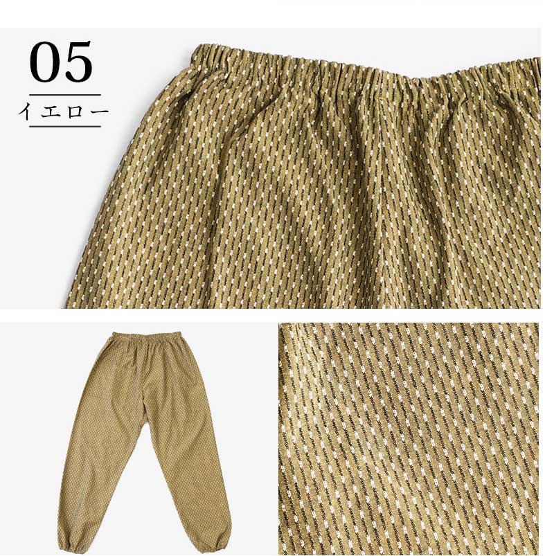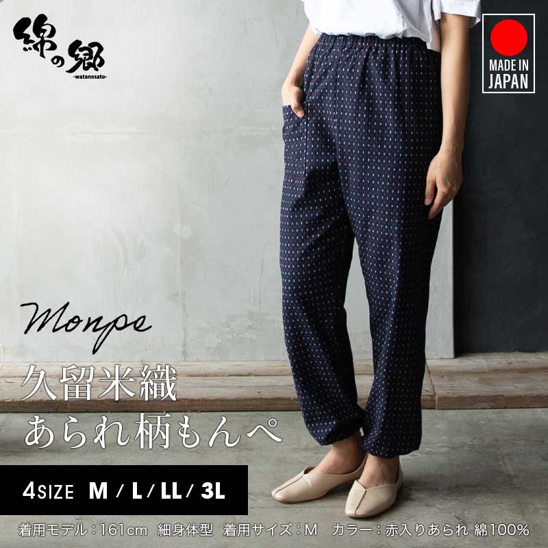 | 商品紹介 | 当社で最も販売数が多い大人気のあられ柄もんぺです。部屋着、作業着、ガーデニング、農作業、旅行時など使い方は様々で大変便利です。 元々は袴の形状であるものに上着を入れて履き、裾を動きやすいように変化させたスタイルのものでした。 現在ではウエストや裾にゴムを入れたものがもんぺとして販売されています。着やすい、動きやすい、汗をかいてもベタベタしない、活動しやすい、洗濯が容易、など日常生活で使用するのに大変便利です。 【久留米織とは】 主に広幅の織機を使用し、ドビー織で織物が作られています。 ドビー織とは織機の枠(わく)と呼ばれる経糸が通ったものを上下に開口させる装置のことをいいます。 枠の枚数が多いほど複雑な織物を織ることができます。また、緯糸を自由に複数色の糸を使用して織ることができます。 糸の配列や筬(おさ)の通し方で表面変化が出たり、風合いが変化するのも特徴です。(筬とは打ち込みをする部分) 織の設計には熟練が必要で、当社のドビー織は枠枚数が最大20枚で様々な模様を作ることができます。 " |