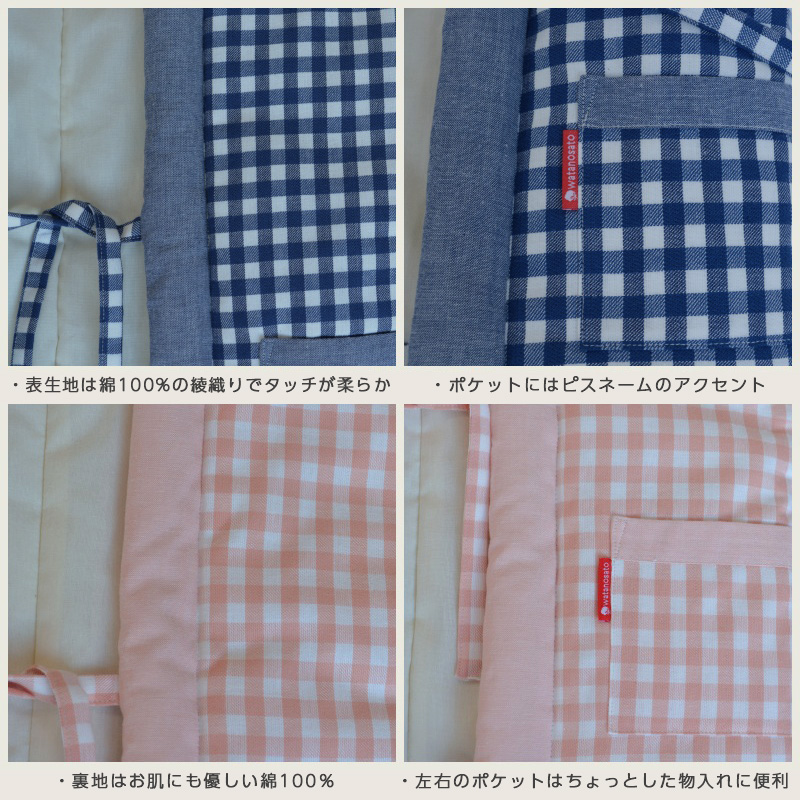 色は男の子用のブルーと女の子用のピンクを用意、ギンガムチェックが柔らかい印象で暖かみを感じさせます。